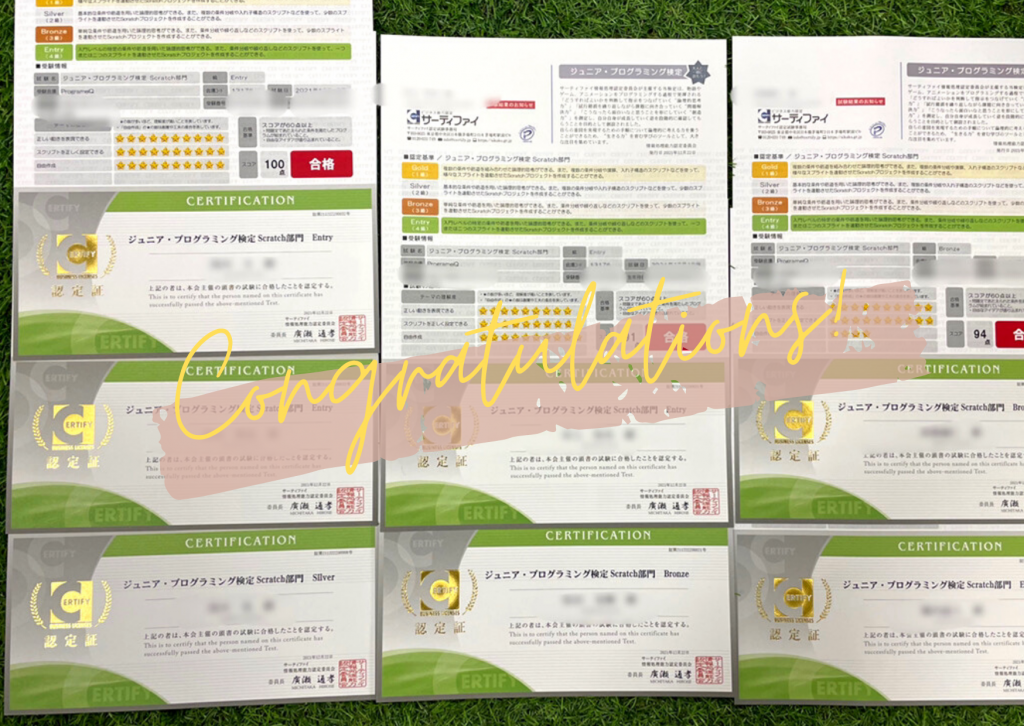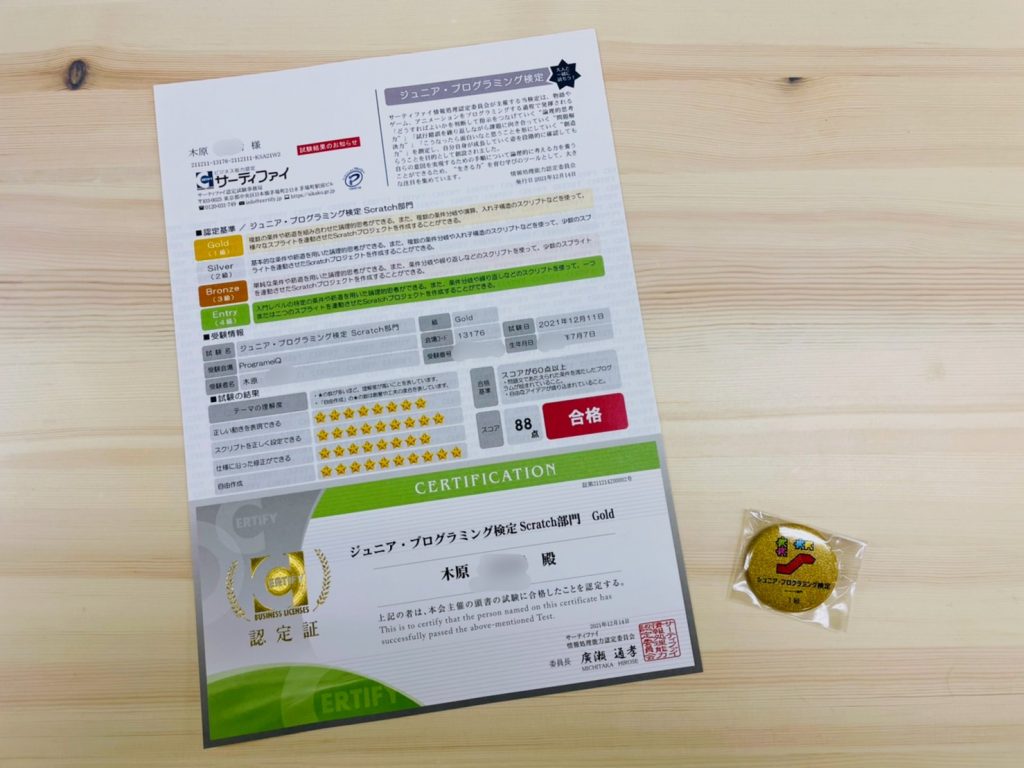 ジュニアプログラミング検定に合格すると、認定証と認定缶バッジが貰えます。