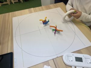 ブロックをtoioキューブの上にくっつけて、相手をより効率よく倒すにはどうすれば良いのか?を考えます。