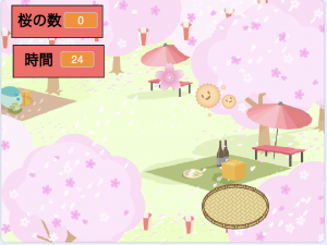 花粉をよけながら、桜をゲットするゲームです。桜をゲットしたら1点、花粉をゲットするとマイナス1点です。音声が鳴ったり、桜が回転するのがポイント。