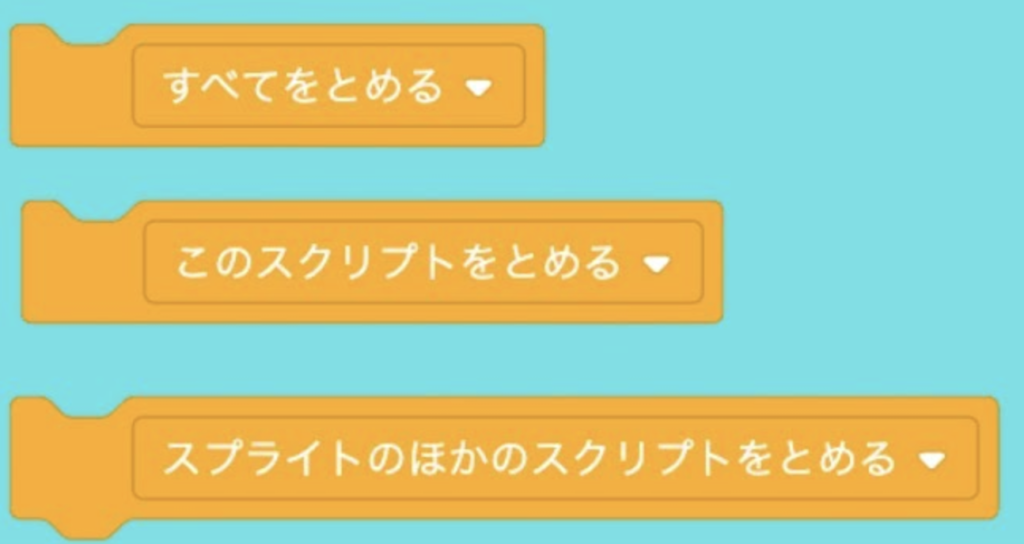 - このスクリプトを止める:そのブロックが含まれる一連の命令だけを止めます。