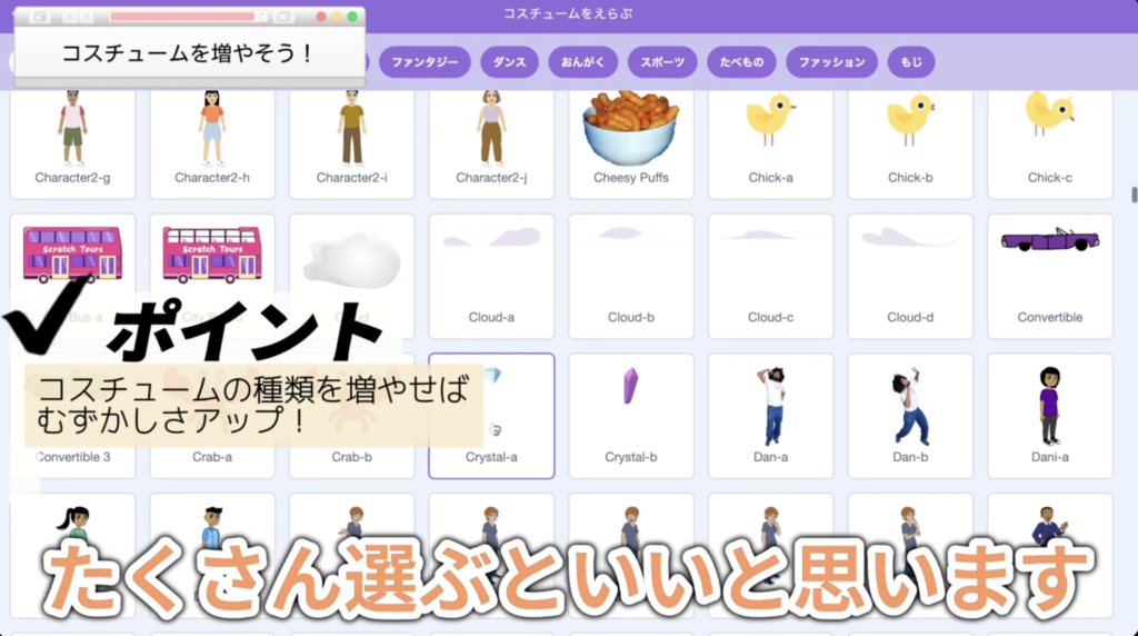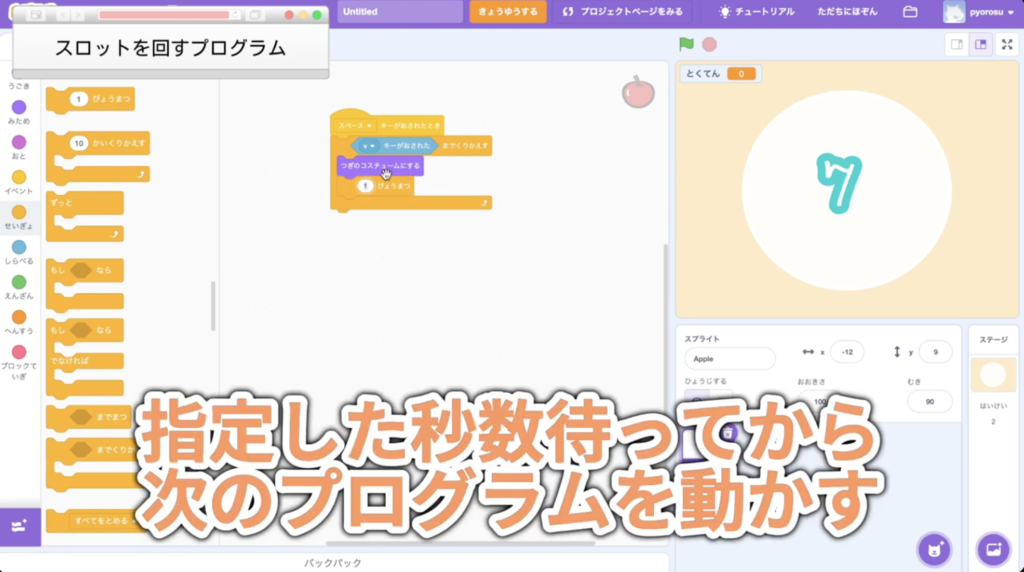 Scratchにはたくさんの可愛いイラストがありますが、あえてリンゴやケーキ、数字の「7」など、お子さん自身に選んでもらうのがポイントです。