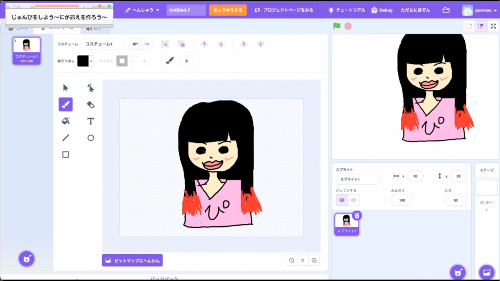 自分で描きたい場合は、スプライト追加のところで「描く」を選びます。すると真っ白な状態で描けるので、自分の顔(自画像キャラ)を作ってみましょう。