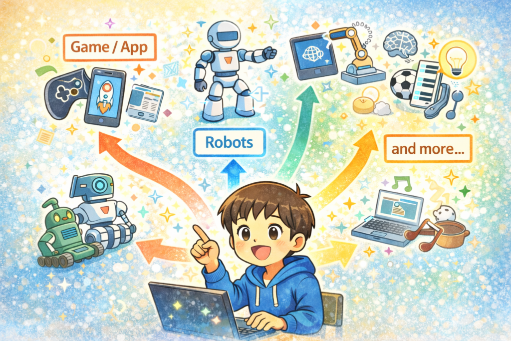 プログラミングは、将来の仕事に一本道で直結するというより、夢と選択肢を増やす土台になります。
