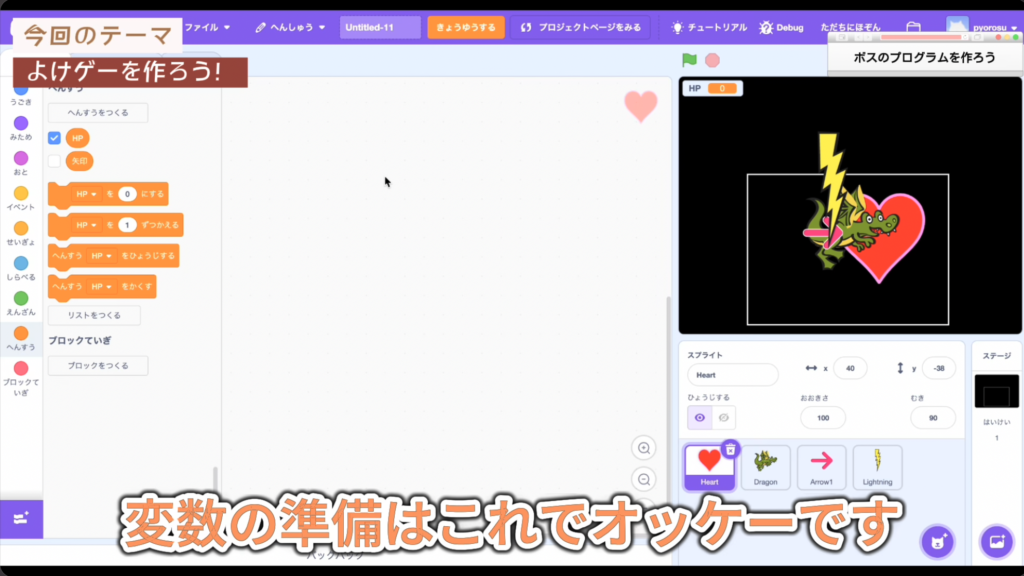 - 変数は HP と 矢印(攻撃制御用) の2つを作る(HPだけ表示)