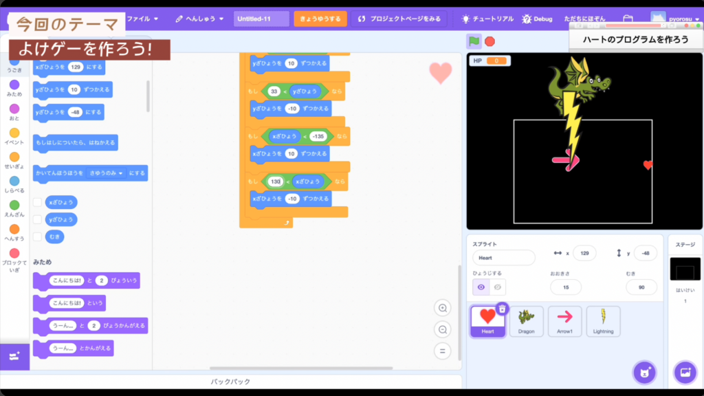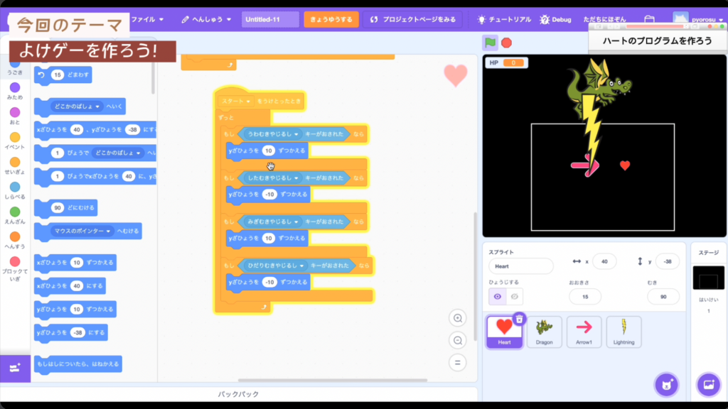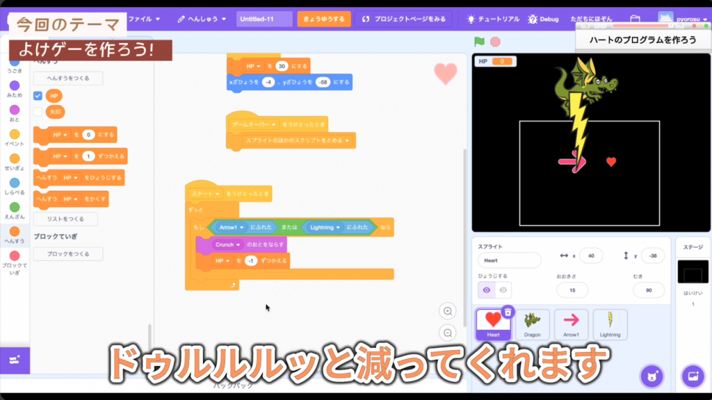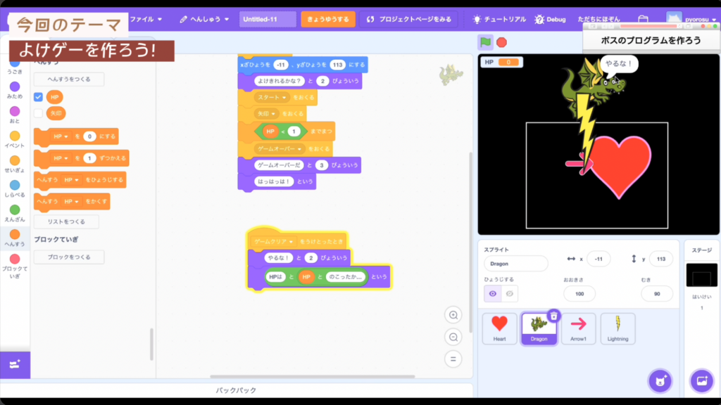 後半では、いよいよ敵の攻撃(矢印・雷)の動きを作って、背景など仕上げに入っていきます。ここから一気に楽しくなります。
