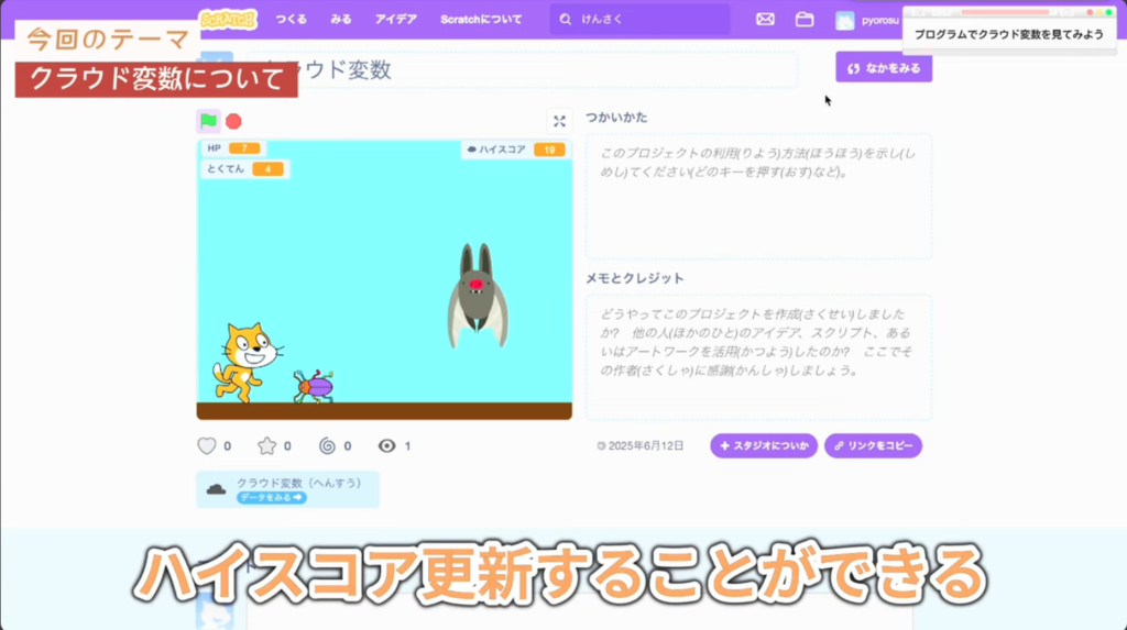 動画では「ハイスコア」をクラウド変数にして、ゲームの得点が更新されたらハイスコアを書き換える仕組みを作っていました。