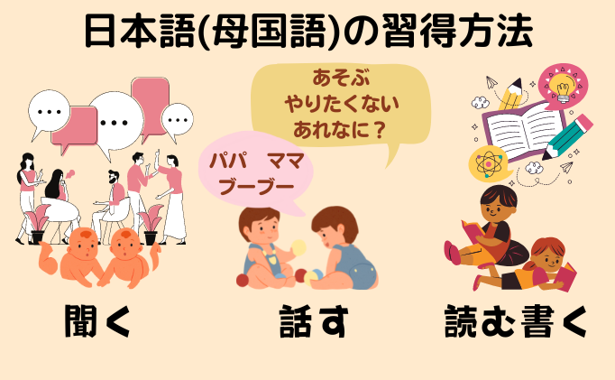 私たちが日本語を喋れるのは、赤ちゃんの頃から親や周りの人、テレビ、街中など常にたくさんの日本語での会話を聞いてきたからです。