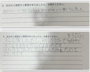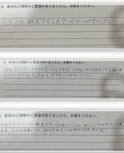 今回のイベントは高学年〜中学生メインというこのもあり、既にSDGsについて知ってる子が多かったため、鉛筆がスラスラ動いていました。