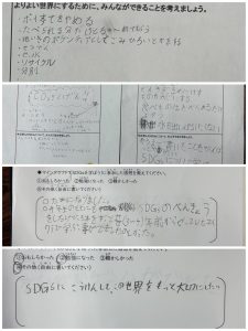 「初めにSDGsについて知ってる人〜?」と聞くと、ほとんどの子が手をあげてくれました。(学校で習ったのかもしれません!)